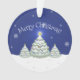 Ajoutez une touche de fantaisie à votre sapin de Noël avec un ornement d'arbre de Noël bleu. Le design ornemental présente un trio d'arbres de Noël décorés dans la neige avec des flocons de neige tombants contre un arrière - plan bleu. Autres cadeaux et objets de vacances disponibles avec ce design aussi.