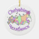 Ornement coloré de carte de la Fédération de Russie avec l'emplacement de ville de Chelyabinsk identifié par un drapeau. Nom de ville également dans le Russe - Челябинск. Famille unique de la Russie ou adoption ou cadeau de Noël pour des familles avec des enfants de Chelyabinsk. Conçu par Hendrika de www.RedThreadMaps.com