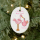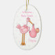 Un ornement en céramique ovale adorable pour l'arrivée du bébé. Cigogne de caractéristiques de conception portant le paquet rose de bébé. Perfectionnez pour le cadeau de baby shower ! Personnalisez avec le texte pour votre occasion spéciale.