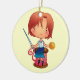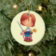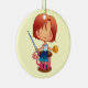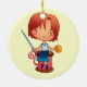 Un double ornement dégrossi comportant une fille mignonne de bande dessinée avec les cheveux rouges, se reposant sur une bobine géante de coton rose, tenant une aiguille et un bouton jaune avec 4 trous.