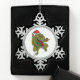 Un dessin d'une bande dessinée T-Rex utilisant un casquette du père noël et tenant des présents dans lui est des mains.