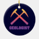 Géologue - ornement bleu-foncé avec le lettrage collégial de style et les marteaux croisés de roche graphiques dans des couleurs oranges, rouges et pourpres de coucher du soleil.
