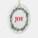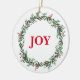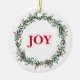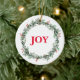 Cet ornement en céramique de Noël est présenté avec une impression festive de couronne de baies de fêtes et texte : JOY. Customisez cet objet ou achetez tel quel. Image stock