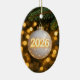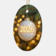 Un ornement en verre représentant l'année 2026 se balance à une branche de pin, illuminé par la lueur chaude de lumières dorées douces.