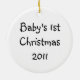 Un bébé avec un casquette plein et des boules d'arbres de vacances avec le texte qui dit "joie" sur un ornement que vous pouvez facilement customiser pour le 1er Noël du bébé.