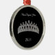 L'ornement de Noël est présenté en forme ronde avec une jolie tiare en cristal argenté scintillante, avec du texte blanc sur un arrière - plan de couleur noire. Montré avec ruban rouge et argenté. Customisez cet article et modifiez l'exemple de texte avec votre nom, date ou autre titre de concours personnel.