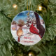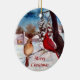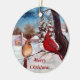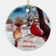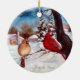 D'une peinture à l'huile originale par Brenda Thour d'un mâle et d'une séance cardinale femelle sur une branche d'arbre le soir avec une belle neige a couvert la maison à l'arrière-plan. Copyright par Brenda Thour 2005.