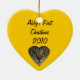 Après avoir été chat-moins pendant quelques mois, je suis allé chez la société humanitaire et suis venu à la maison avec vieil Abby de quatre mois. Elle est un chaton tigré rayé doux, gris et noir, plein de l'énergie. Cet ornement personnalisable et en forme de coeur de Noël a une photo en gros plan de son visage, avec les rayures au-dessus de son vert, yeux noir-décrits, de peu de bouche brune de nez, et blanche. Sur le dos est le manuscrit noir, "le premier Noël 2010 d'Abby" sur l'arrière - plan or-jaune. J'ai ajouté un petit coupe-circuit en forme de coeur de son visage au-dessous du 2010. Et s'il n'y a aucun typo dans cette description, ce n'est aucun merci à Abby, qui a dépensé le temps plein s'élevant au-dessus de mon clavier !