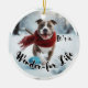 Cet ornement en céramique présente un Pitbull qui s'amuse à jouer dans la neige. L'imprimé sur l'ornement affirmant que ce chiot pourchassant une balle dans la neige vit une "Merveilleuse "fourrure" Vie". L'ornement est de 4,87 pouces, rond et en céramique, vient avec un fil suspendu. Un joli ajout à votre décor d'arbre généalogique.