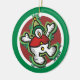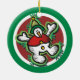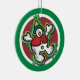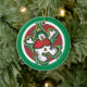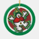 Ce joli ornement de Noël met en scène un bonhomme de neige sur un arrière - plan rouge, blanc et vert.