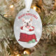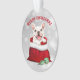 Un adorable petit Bulldog français blanc sort d'un sac cadeau rouge sur le devant de cet ornement de Noël. Quelques ampoules turquoises et or motif Holiday sont juste devant le sac Père Noël.Le texte au-dessus de l'image dit "MERRY CHRISTMAS" en rouge. L'image et le texte sont placés sur un arrière - plan de livre abstrait argenté. Le fond de l'ornement a la même image, mais avec le texte "HAPPY NEW YEAR" en vert turquoise.