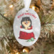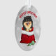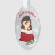 Un adorable petit Poméranien noir et bronzé sort d'un sac cadeau rouge sur le devant de cet ornement de Noël. Quelques ampoules turquoises et or motif Holiday sont juste devant le sac Père Noël.Le texte au-dessus de l'image dit "MERRY CHRISTMAS" en rouge. L'image et le texte sont placés sur un arrière - plan de livre abstrait argenté. Le fond de l'ornement a la même image, mais avec le texte "HAPPY NEW YEAR" en vert turquoise.