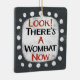 Un dessin typographique irrévérencieusement bizarre qui dit "Regarde ! Il y a A Wombat Now". Il présente du texte noir et rouge sur un rectangle blanc avec des points blancs amusants et amusants qui l'entourent, le tout sur un arrière - plan gris.