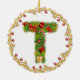 ornement décoré d'un monogramme initial de Noël de T - cercle. Cette décoration exquise d'arbre de Noël de la lettre T donnera à votre Noël un contact traditionnel avec une sensation personnalisée moderne. A conçu pour ressembler à un arbre de sapin couvert de présents et des cadeaux cette lettre a sur un ornement circulaire est entourés par un cadre d'or avec les baies rouges. Le haut de gamme et tendent dessus ceci est un luxe abordable pour vous les besoins de décor de vacances. Le double a dégrossi pour l'impact supplémentaire ce vert et l'image rouge sur un arrière - plan de blanc neigeux est un favori avec des entreprises également. Alphabet en entier disponible.