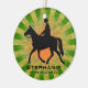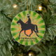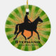 Équitation équitation Equestre Ornement personnalisé Noël 20XX. Un équestre pose à cheval contre un arrière - plan de starburst vert et orange. Tout le texte personnalisable, avant et arrière !