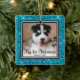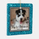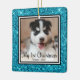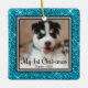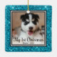Ce joli ornement photo de 1er Noël de Chiot avec un bord de parties scintillant d'aqua, les mots "Mon 1er Noël", le nom de votre chien et l'année sera belle sur votre arbre. Vous allez le chérir et aimer le sortir chaque année pour mettre sur votre arbre.