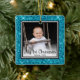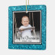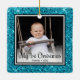 Ce joli ornement photo de 1er Noël de bébé avec un bord de parties scintillant d'aqua, les mots "Mon 1er Noël", le nom de votre enfant et l'année sera belle sur votre arbre. Vous le chérirez et vous apprécierez de le prendre chaque année pour mettre sur votre arbre.