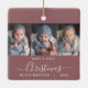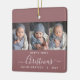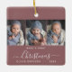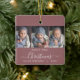 Aidez-les à commémorer le premier Noël de leur petit-enfant avec ce magnifique ornement moderne de gardien. Le texte blanc indique "Le premier Noël du bébé", avec le mot "Noël" dans un élégant script d'écriture manuscrite avec des fioritures avant et après sur un arrière - plan rose poussiéreux. Remplacez les trois exemples d'images par vos photos verticales préférées, et ajoutez le nom du bébé et l'année.