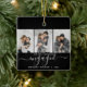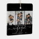 Commémorez votre fiançailles avec ce magnifique ornement de gardien moderne. Le texte blanc dit "Notre premier Noël engagé", avec le mot "engagé" dans un élégant script d'écriture manuscrite avec des fioritures avant et après. Remplacez les trois exemples d'images par vos photos verticales préférées, et ajoutez vos noms et l'année en blanc sur un arrière - plan noir.