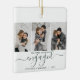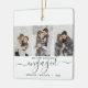 Commémorez votre fiançailles avec ce magnifique ornement de gardien moderne. Le texte vert foncé dit "Notre premier Noël engagé", avec le mot "engagé" dans un élégant script d'écriture manuscrite avec des fioritures avant et après. Remplacez les trois exemples d'images par vos photos verticales préférées, et ajoutez vos noms et l'année en vert foncé sur un arrière - plan blanc.