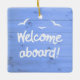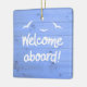 Bois Bleu patiné Accueil À Bord De L'Ornement En Céramique Nautique. Idée cadeau pour le bateau ou le propriétaire de yacht. Pour la maison de plage ou la maison côtière. Les mots Bienvenue à bord en blanc, avec des mouettes blanches au-dessus. Sur un arrière - plan en bois patiné bleu. Comme le pont de bateau.