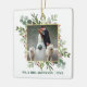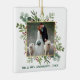 Elégante aquarelle Végétation hivernale M. et Mme Mariage Photo Nouveau marié Noël Ornement comprend des feuilles d'eucalyptus et des baies saintes rouges. Texte vert. Cadre Or.