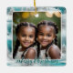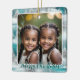 Créez votre propre ornement festif, avec une photo préférée sur le devant, et votre propre texte sur le dos. L'ornement en céramique fait un délicieux cadeau de conservation pour la famille et les amis. L'arrière - plan est une scène hivernale avec des arbres dans la neige, dans l'élégant aqua, gris et blanc. Avec l'accueil 'Joyeux Noël' sur le devant dans une élégante typographie de script, l'ornement peut être personnalisé avec votre propre message sur le dos.
