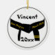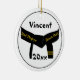 Customisez l'unique Martial Arts deuxième degré Black Belt Round Ornament avec le nom de votre artiste martiale et l'année en cours. Créez un cadeau de ceinture noire personnalisé pour commémorer un test de promotion de ceinture noire 2e Dan ou examen, anniversaire ou fête. Celui-ci d'un ornement d'arts martiaux sur mesure comprend une numériquement photo améliorée d'une ceinture noire d'arts martiaux avec deux barres d'or sur le devant avec les mots Black Belt Club sur le dos. Convient à tous les arts martiaux y compris le karaté, taekwondo, kung fu et judo.
