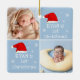 Baby`s First Christmas 2 Photos Santa Hat Snowflake Blue Ceramic Ornement. Premier design de Noël du bébé mignon avec chapeau de Père Noël rouge, flocons de neige, un nom de bébé dans un script blanc une photo de bébé - personnalisez avec le nom et les photos de votre bébé.