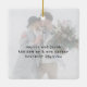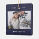 Ces ornements de Noël simples et minimalistes présentent votre photo de mariage préférée sur le devant avec vos initiales, l'année, et les mots "joyeux et mariés" en blanc de machine à écrire look texte sur un arrière - plan rustique, de bois bleu. L'arrière comporte une autre de vos photos mariages, éclairées par une superposition pour que vous puissiez ajouter du texte ou des noms supplémentaires directement sur elle. Un gardien élégant pour votre premier Noël en tant que mari et femme.