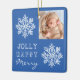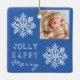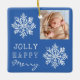 Blue Jolly Joyeux Flocon de neige Photo Noël Ornement de Noël. Joli flocon blanc sur un arrière - plan bleu. Joyeux, Joyeux, Jolly texte dans une typographie festive. Le design a une photo personnalisée - insérez votre photo préférée dans le modèle et faites votre ornement de Noël personnel unique.