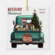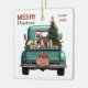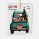 Un pick-up bleu turquoise porte un arbre de Noël décoré et des colis cadeaux sur ce joli ornement de Noël en verre. En regardant de la porte arrière est un beau chien Bullmastiff portant un casquette de Père Noël rouge et blanc. Un panneau en bois rustique sur le pare-chocs arrière dit "Cheer de Noël". Le texte stylisé rouge et vert en haut à gauche dit "MERRY CHRISTMAS", avec votre nom (ou celui de votre chien) et l'année à droite. Les deux camps ont la même image.