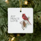 Beau cardinal rouge avec cône de pin et JOY PEACE LOVE type sur le devant et Nom et Année sur le dos, ornement céramique.