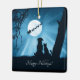 Si mignon, un chien et un chat s'assoient sous un arbre en regardant la magie de Noël se dérouler la nuit même. Une grande pleine lune fait Père Noël et ses silhouettes de rennes contre le ciel. Un ornement fantaisiste de Noël animal de compagnie chéri.