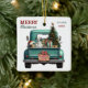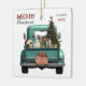 Un pick-up bleu turquoise porte un arbre de Noël décoré et des colis cadeaux sur ce joli ornement de Noël en verre. En regardant de la porte arrière est un beau chien dalmate. Un panneau en bois rustique sur le pare-chocs arrière dit "Cheer de Noël". Le texte stylisé rouge et vert en haut à gauche dit "MERRY CHRISTMAS", avec votre nom (ou celui de votre chien) et l'année à droite. Les deux camps ont la même image.