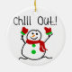 Un mignon bonhomme de neige avec un foulard rouge et des mitaines rouges et un texte qui dit "Chill Out!" sur un joli ornement de gardien de vacances de bonhomme de neige.