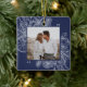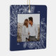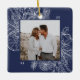 Un décor de vacances moderne et élégant qui encadre votre photo carré préférée dans un cadre magnifiquement détaillé avec des pics de pin, des feuilles d'hiver, de l'anis étoilé et des tranches d'agrumes sur un arrière - plan bleu marine riche. Personnalisez l'arrière de cet unique ornement photo de Noël avec votre nom de famille.