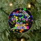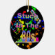 Ornement céramique ronde avec une image de plaques de peinture rouge, orange, jaune, vert et bleu, baskets haut-de-gamme dans les couleurs néon, cassettes, lunettes de soleil colorées et le texte "Coincé dans les années 80" en lettres néon. Un dos noir. Voir l'ensemble de la collection d'ornement des années 80 dans les TOUCHES SPÉCIALES | Section Favoris.