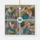 Créez votre propre collage photo avec 4 images dans une grille carré avec des bordures bleu-vert minces sur un arrière - plan blanc. Un cercle blanc avec une bordure turquoise chevauche les coins des photos au centre et présente votre monogramme dans une police turquoise en gras. Ajoutez vos photos et vos initiales dans la barre latérale pour les personnaliser. Fait un grand cadeau de Noël personnalisé. Copyright de la conception d'ornement ©Claire E. Skinner. Photographie © Storytree Studios, Stanford, CA