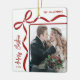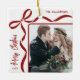 This double-sided Christmas ornament lets you feature a different photo on each side or use the same one for a coordinated look. A hand-drawn red bow sits in the top left, with ribbon lines running across the top and down the left edge for a simple decorative touch. “Merry Christmas” appears vertically along the bottom left, with the date just beneath it, and your name in the top right for a balanced layout.