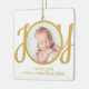 This cute Baby's First Christmas Photo Ornament is decorated with the word JOY in stylish gold script typography on a white background.