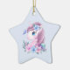Ornement avec une adorable image d'un doux portrait de tête de licorne bébé. Un petit papillon qui visite, floutant près de son nez. Un bouquet de fleurs autour de son cou complètent ce design très mignon.
