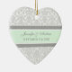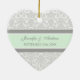 Ornement personnalisable de mariage de nom et de date dans le motif floral classique léger élégant et moderne de vert de menthe de pastel, gris et blanc de damassé. Perfectionnez comme souvenir de Noël pour se rappeler votre jour spécial ou pour célébrer votre premier Noël ou en tant que faveurs les épousant personnalisées pour vos invités.