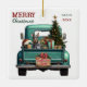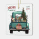 Un pick-up bleu turquoise porte un arbre de Noël décoré et des colis cadeaux sur ce joli ornement de Noël en verre. Vue de la hayon arrière est un beau chien Doberman Pinscher. Un panneau en bois rustique sur le pare-chocs arrière dit "Cheer de Noël". Le texte stylisé rouge et vert en haut à gauche dit "MERRY CHRISTMAS", avec votre nom (ou celui de votre chien) et l'année à droite. Les deux camps ont la même image.