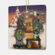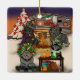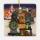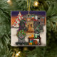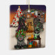 Beau chien de chiot de Terre-Neuve dessiné à la main et coloré présenté dans une fête de camping-car de vacances, avec un feu de joie, un arbre de Noël géant, des lumières et même des rafraîchissements!