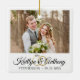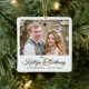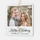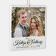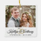 Créez un élégant ornement commémoratif blanc mariage avec une ou deux photos, une police de script de calligraphie élégante pour les noms du couple avec anneaux mariages et leur date de mariage. Faites un mariage ou un cadeau de vacances significatif pour les jeunes mariés ou créez-en un pour commémorer votre premier Noël en tant que Monsieur et Madame Pour des modifications ou de l'aide, contactez le concepteur AVANT DE COMMANDER via Zazzle Conversation ou makeitaboutyoustore@gmail.com.
