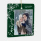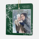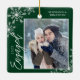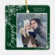 Cet ornement de Noël carré est un cadeau parfait pour le couple nouvellement engagé. Le design comprend un cadre photo avec le texte manuscrit "Engagé" et est accentué de flocons de neige gris clair sur un arrière - plan vert foncé. Personnalisez avec des photos du couple, leurs noms et l'année.