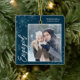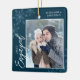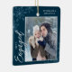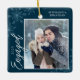 Cet ornement de Noël carré bleu foncé est un cadeau parfait pour le couple nouvellement engagé. Le design comprend un cadre photo avec le texte manuscrit "Engagé" et est accentué de flocons de neige bleu clair sur un arrière - plan bleu foncé. Personnalisez avec des photos du couple, leurs noms et l'année.
