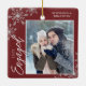Cet ornement de Noël carré rouge est un cadeau parfait pour le couple nouvellement engagé. Le design comprend un cadre photo avec le texte manuscrit "Engagé" et est accentué de flocons de neige gris clair sur un arrière - plan rouge. Personnalisez avec des photos du couple, leurs noms et l'année.