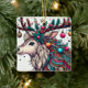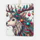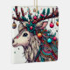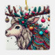 Cette illustration éclatante présente un renne orné de décorations de Noël complexes. Ses bois se transforment en un spectacle festif, orné de saints, de baies, d'ornements et d'étoiles scintillantes. La tête de renne est décorée de motifs et de perles colorés, qui capturent la joie et la magie de la saison des fêtes.